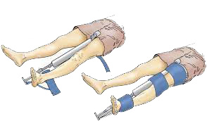- 延長夾板內軸以施加牽引力。 對於閉合性中段骨折,施加患者體重的 10%,最大重量為 10 磅。 而對於開放性骨折或關節損傷,則施加最大 5 磅的牽引力